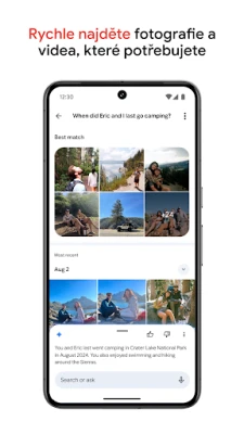 Procházení vaší galerie je nyní snazší než kdy dříve. Fotky Google vám umožní najít cokoli okamžitě – stačí popsat, co hledáte, třeba „Alice a já se smějeme" nebo „pádlování na jezeře obklopeném horami". Aplikace inteligentně organizuje vaši sbírku, automaticky seskupuje podobné snímky a vytváří přehledné složky pro screenshoty či dokumenty. Vaše osobní galerie tak zůstává vždy uspořádaná. Navíc můžete citlivé snímky a videa uchovat v uzamčené složce, chráněné zabezpečením vašeho zařízení, a díky pokročilé infrastruktuře společnosti Google jsou vaše vzpomínky chráněné od okamžiku uložení.