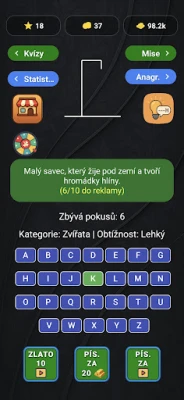 Každý den na vás čekají nové mise, které prověří vaši rychlost i znalosti v různých slovních disciplínách. Plňte denní výzvy, kombinujte kategorie v jedné misi a dokončujte kvízy pro splnění misí, abyste za každou úspěšně dokončenou získali zlato. Nezapomeňte zatočit kolem štěstí – jednou denně zdarma, s možností extra otočky po zhlédnutí krátké reklamy – a objevte další odměny v podobě mincí či zlata, vždy něco vyhrajete! Sledujte svůj postup v detailních statistikách a šplhejte po online žebříčku Google Play, abyste se stali uznávaným mistrem slov. Pokud chcete urychlit svůj pokrok a odemknout ještě více obsahu, využijte možnosti obchodu, kde nákup balíčků zlata či extra písmen otevírá další brány k zábavě.